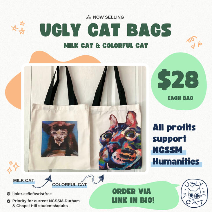 Ugly Cat is a not-for-profit, student-initiated business turning student artwork into wearable swag to support humanities departments in North Carolina high schools. Based in the North Carolina School of Science and Mathematics (NCSSM) in Durham, NC, we believe that the humanities are an ongoing and living expression of human culture, supported by both makers and audiences.All things, STEM and humanities, answer the three questions of life: Who am I? Where did I come from? Why am I here? The humanities clearly answers these; the humanities impact people by telling stories about ourselves and each other. Through grassroots organizing, designing, and advocacy, Ugly Cat chooses to tell these stories by the students, for the students.